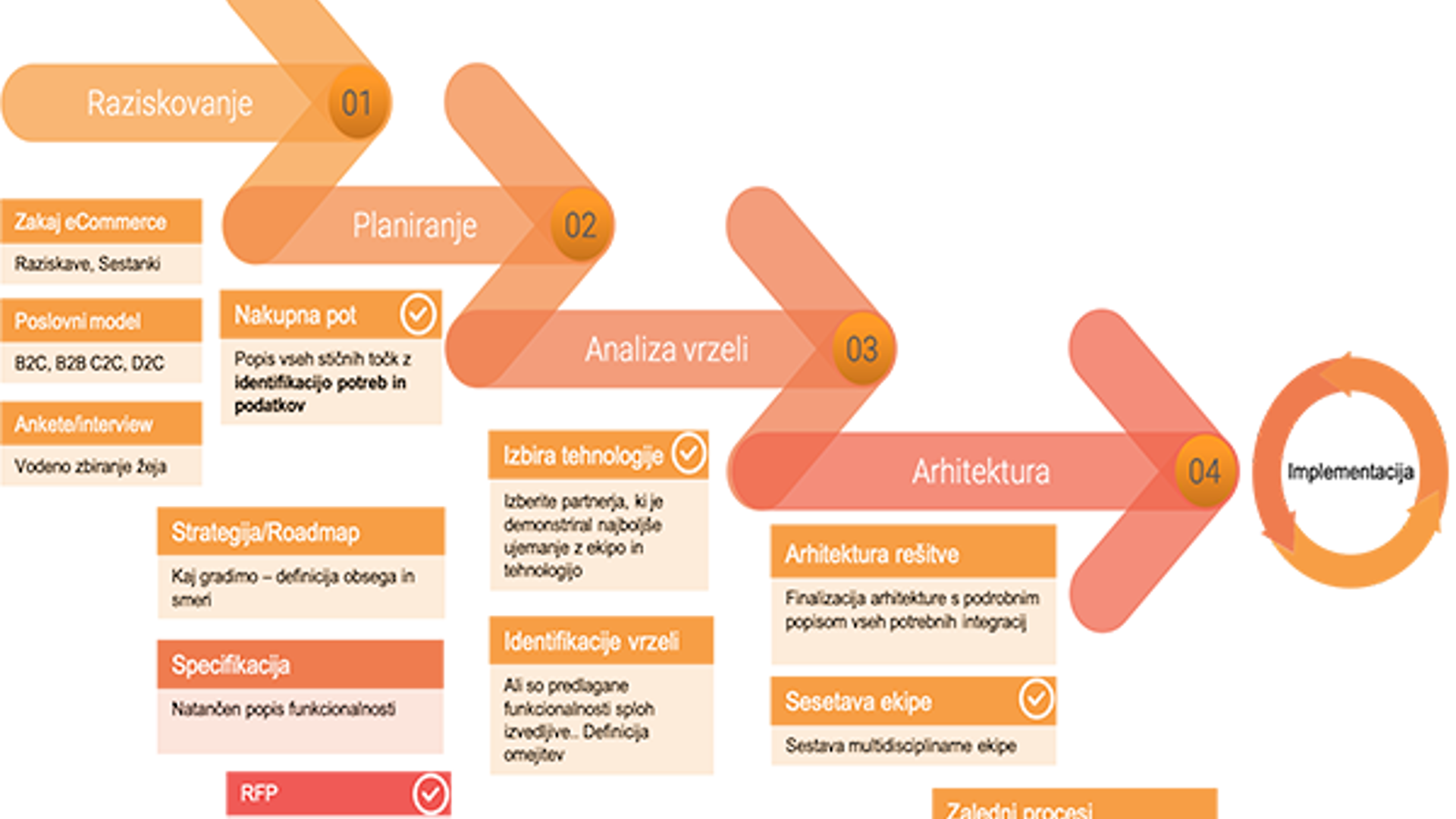 Na tej podlagi zapišemo tehnološke zahteve v roadmap po fazah, saj ne moremo lansirati vseh funkcionalnosti hkrati, in to prevedemo v specifikacije. Ob tem je nujna tudi navedba, katere zaledne sisteme imamo (ERP, PIM, kje bomo pridobivali slike in opise izdelkov itd.), saj se mora nova rešitev povezovati z njimi.